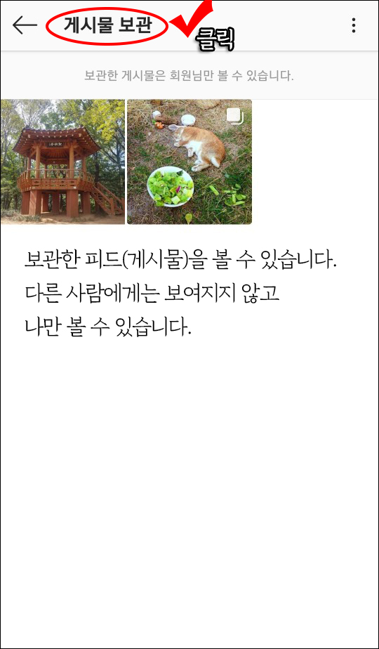 2) 보관을 클릭합니다. * 보관하면, 게시물은 메인에 노출되지 않습니다.